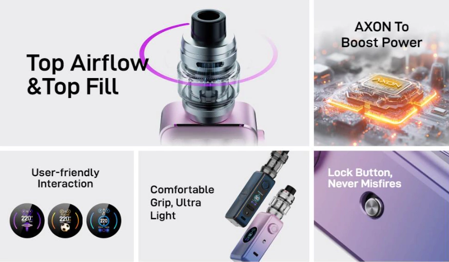 Vaporesso Gen Max Kit se destaca por su diseño ergonómico y robusto. Su carcasa está construida con una combinación de materiales de alta calidad que garantizan durabilidad. El acabado suave al tacto y la forma contorneada permiten un agarre cómodo y seguro, ideal para un uso prolongado.